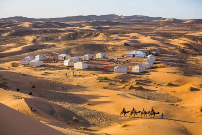 In the afternoon, travel through the scenic Ziz Valley and its volcanic gorges toward Erfoud, known for its fossils and dates. Upon arrival in Merzouga, you’ll trade your car for camels and ride across the dunes of Erg Chebbi at sunset—a magical moment as the sky turns shades of gold and pink.