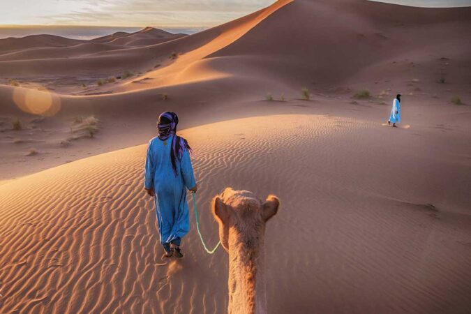 Continue toward the cinematic city of Ouarzazate, the scenic Draa Valley, and finally the golden dunes of Merzouga. Enjoy a camel trek at sunset and spend the night in a traditional Berber desert camp beneath the stars. Along the way, visit the vibrant souk of Rissani, admire the dramatic Todgha Gorge, and explore the stunning Dades and Rose Valleys before returning to Marrakech through the “Road of a Thousand Kasbahs.”